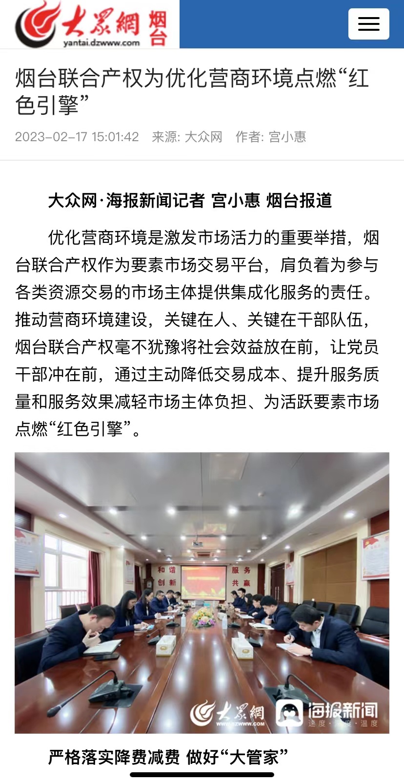 近日,“學(xué)習(xí)強(qiáng)國(guó)”煙臺(tái)平臺(tái)、煙臺(tái)日?qǐng)?bào)社大小新聞網(wǎng)、大眾網(wǎng)煙臺(tái)刊發(fā)署名文章《煙臺(tái)聯(lián)合產(chǎn)權(quán)為優(yōu)化營(yíng)商環(huán)境點(diǎn)燃“紅色引擎”當(dāng)好市場(chǎng)“店小二”》,全面介紹了2022年煙臺(tái)聯(lián)合產(chǎn)權(quán)作為要素市場(chǎng)交易平臺(tái),肩負(fù)著為參與各類(lèi)資源交易的市場(chǎng)主體提供集成化服務(wù)的責(zé)任,在推動(dòng)營(yíng)商環(huán)境建設(shè)方面,毫不猶豫將社會(huì)效益放在前,讓黨員干部沖在前,通過(guò)主動(dòng)降低交易成本、提升服務(wù)質(zhì)量和服務(wù)效果減輕市場(chǎng)主體負(fù)擔(dān)、為活躍要素市場(chǎng)點(diǎn)燃“紅色引擎”。